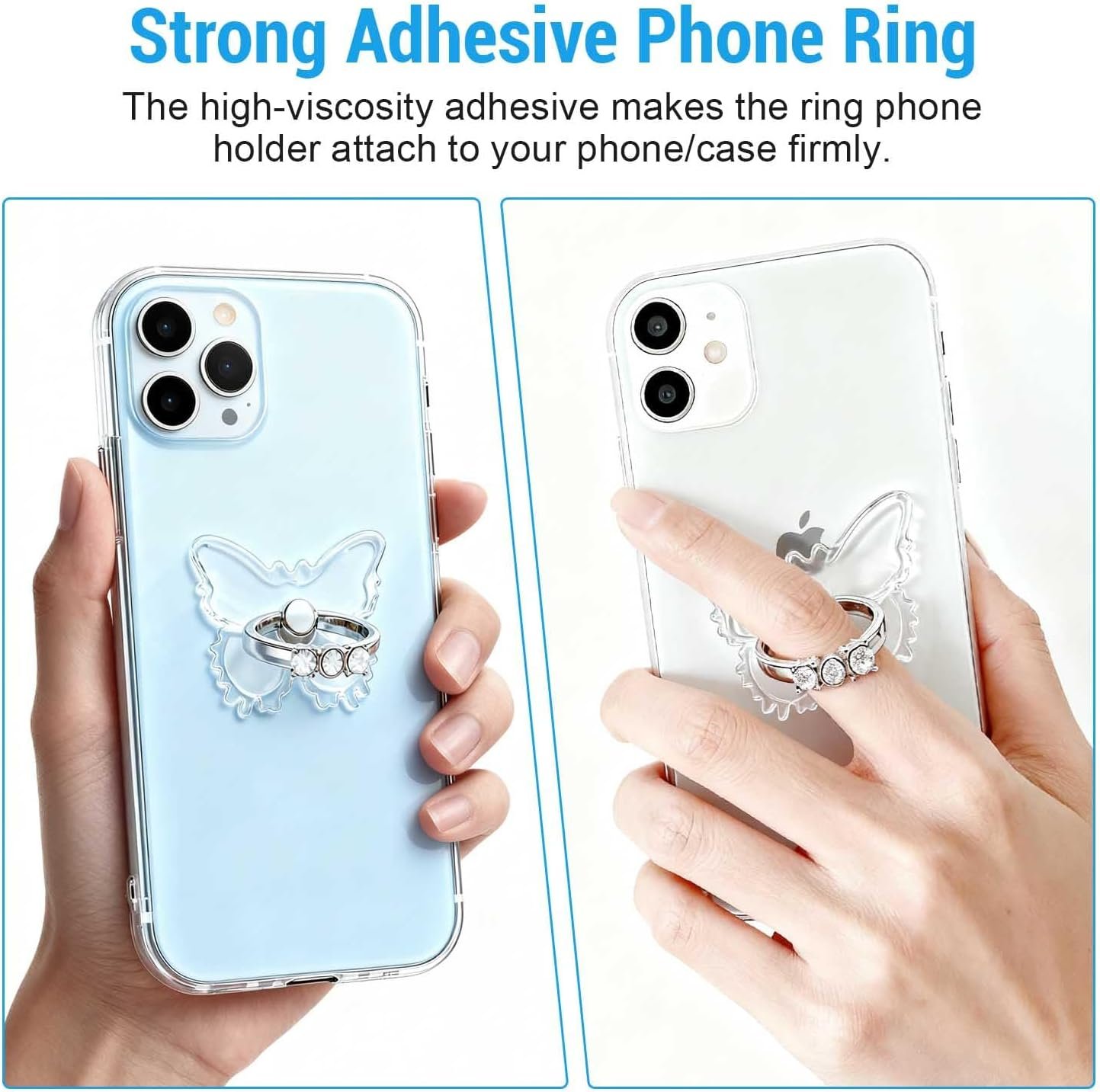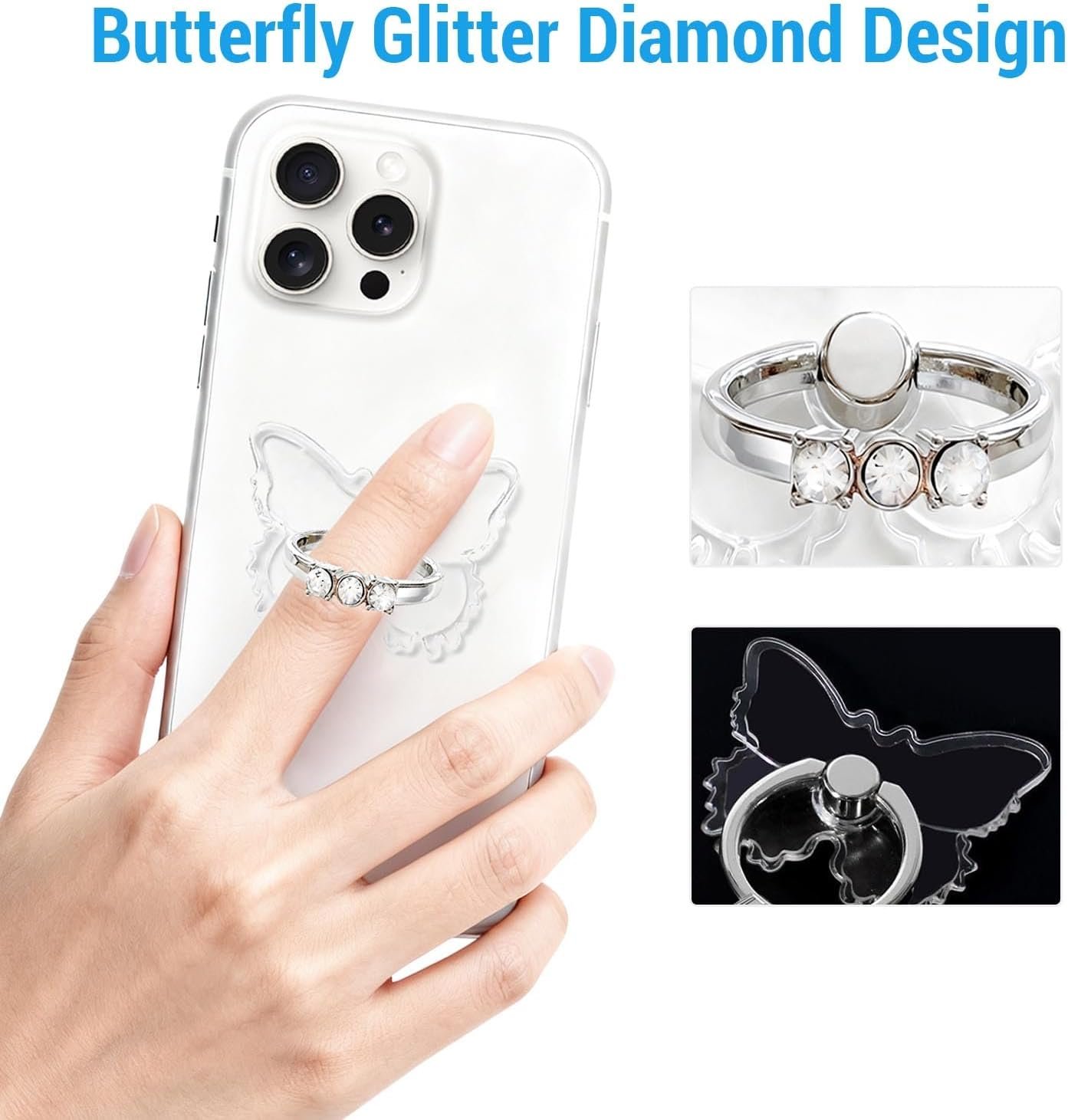 【Butterfly Glitter Diamond Design】 The glitter phone ring holder is inlaid with 3pcs sparkle bling rhinestones,which makes it like a diamond ring and brings you a gorgeous feeling. Our cell phone ring holder finger grip is made of high-quality transparent Acrylic which keeps your phone original feature design without affecting the exterior.