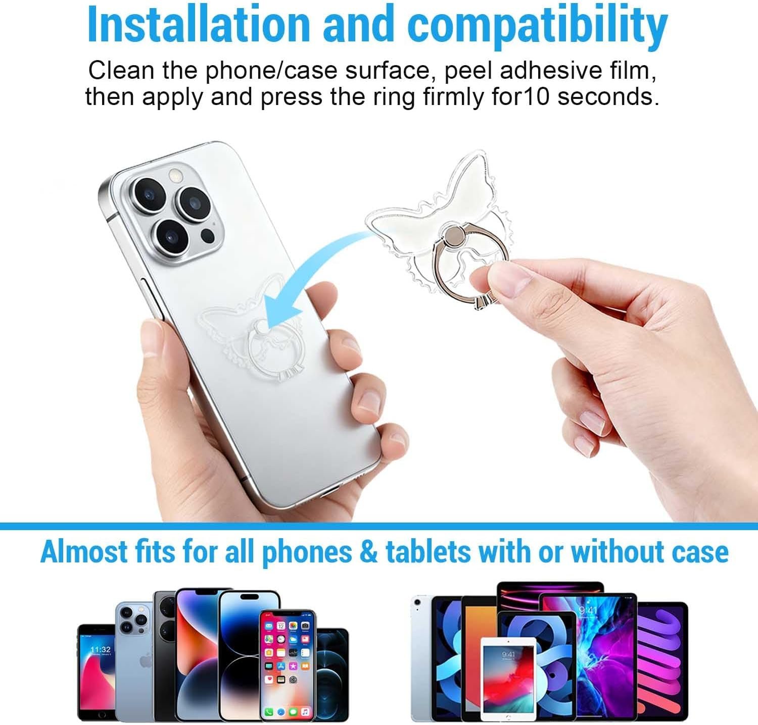 【Installation and compatibility】 Clean the surface of the cell phone ring holder and remove the transparent paper first,then paste the phone finger ring from left to right and press the stand for about ten seconds. Our phone ring grip stand for phone is compatible with almost all mobile phones tablets with or without case.