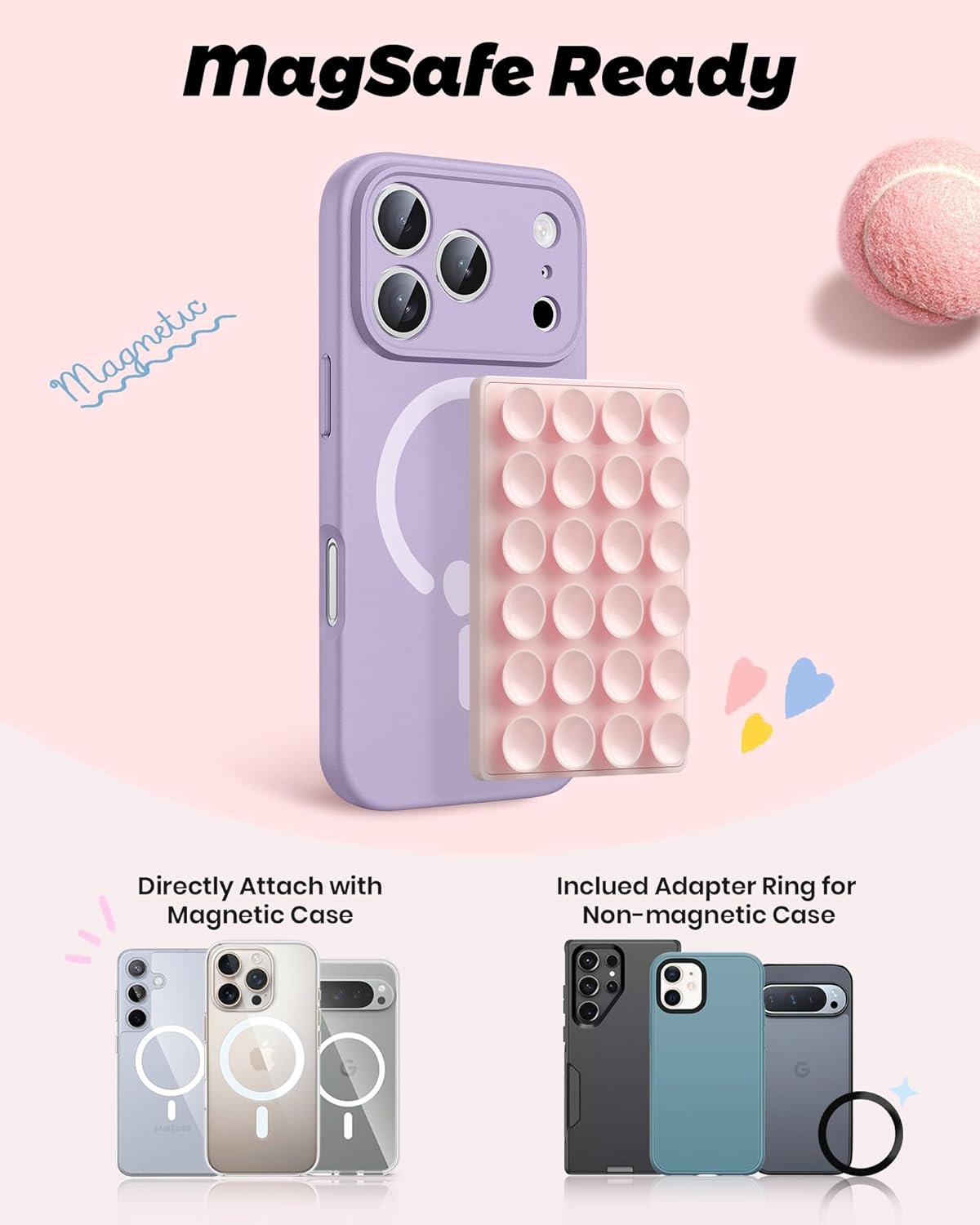 Compatibility Check: Work with iPhone 17/17 Pro/17 Pro Max, iPhone Air, 16/15/14/13/12 Pro Max/Pro/Plus/Mini and other phones with MagSafe cases. For non-MagSafe cases, just use the included magnetic adapter ring for secure attachment.