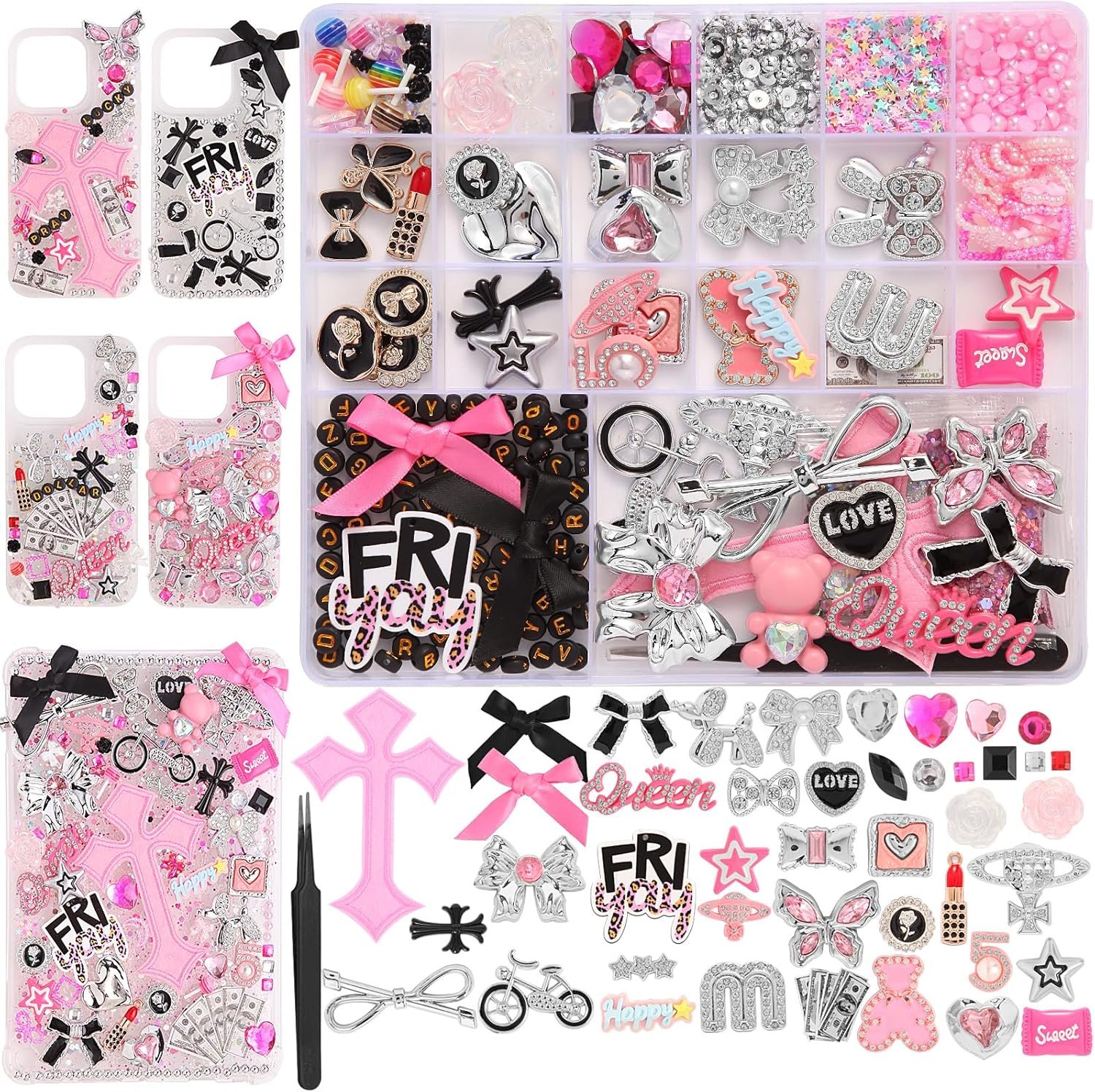 2380 Pcs Junk Case Charms Kit: Contains 39 flat resin large charms, 1 flat resin large, 1 cross patch, 1 tweezers and a large number of flat pearls, rhinestones, black letter beads, glitter, star accessories, creating the ultimate DIY freedom.
