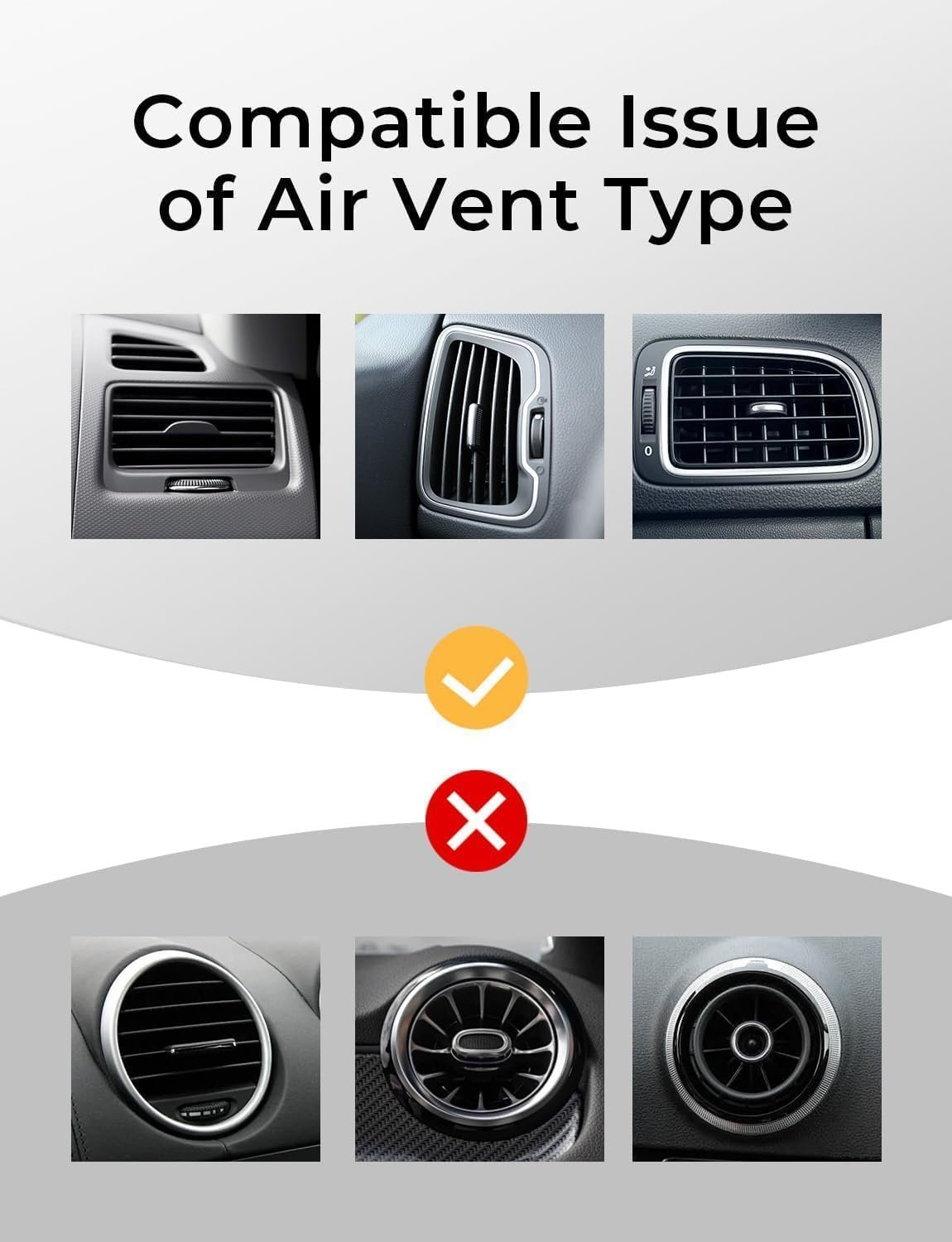 The metal piece should not be placed between the case and the phone, which will cause the magnetic force to become weak and reduce the stability of the stand. Only for square air vents, not for round air vents, e.g. Mercedes-Benz full series, Kia EV6 series