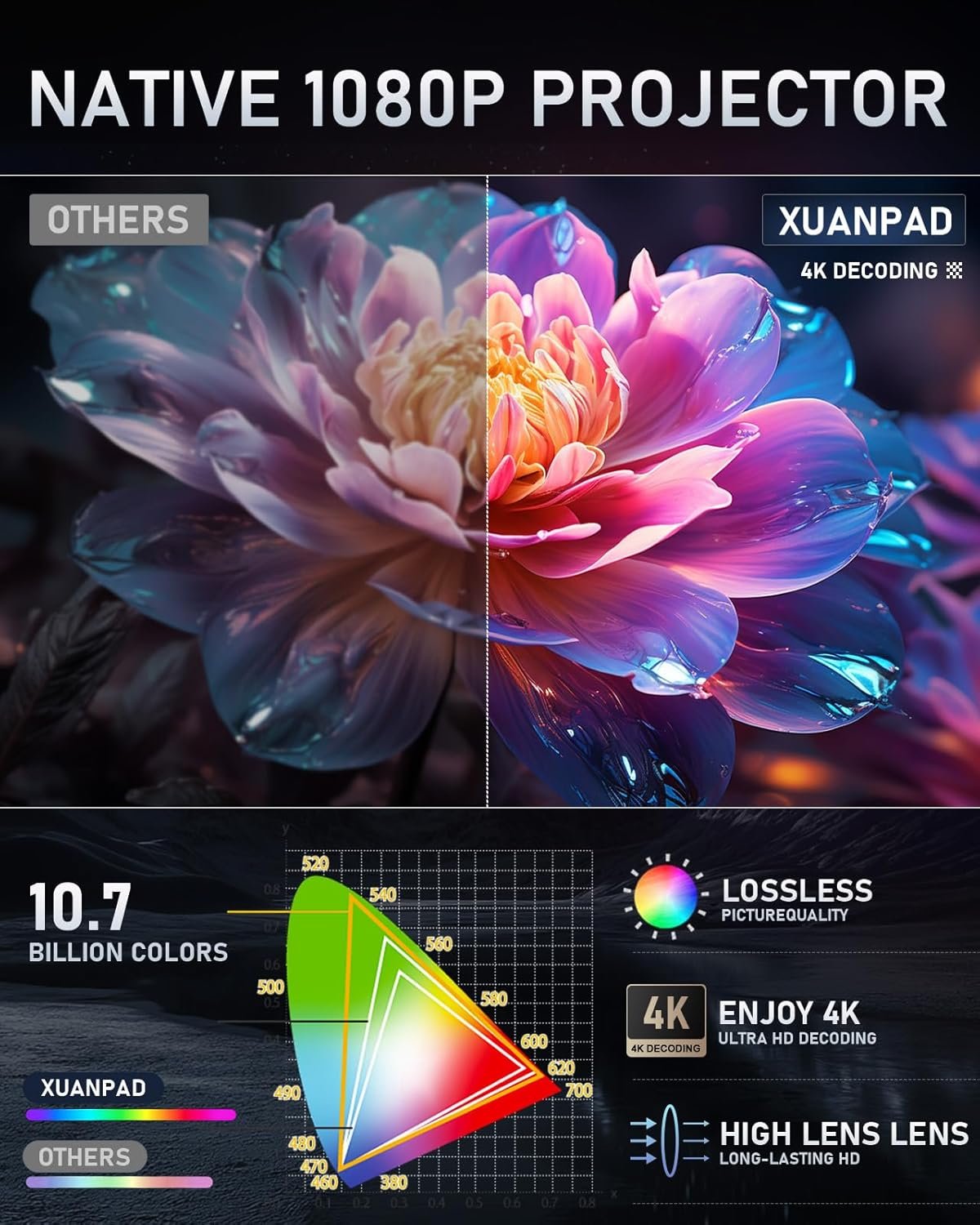 [HD Quality, Eye – Comfortable Viewing] XuanPad native 1080P and 4K decoding projector uses 4 – piece all – glass lenses and an aspheric HD short – focus design. With 98% light transmittance, movie projector surpasses single – lens standard resin lenses for better uniformity and clarity. Its unique pure – copper heat – pipe design improves cooling efficiency by 50% and boosts brightness by 80%, ensuring high brightness and stable operation even during long – term use