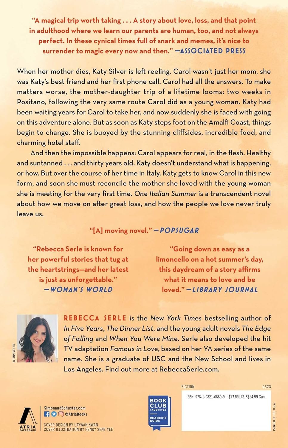 When Katy’s mother dies, she is left reeling. Carol wasn’t just Katy’s mom, but her best friend and first phone call. She had all the answers and now, when Katy needs her the most, she is gone. To make matters worse, their planned mother-daughter trip of a lifetime looms: to Positano, the magical town where Carol spent the summer right before she met Katy’s father. Katy has been waiting years for Carol to take her, and now she is faced with embarking on the adventure alone.
