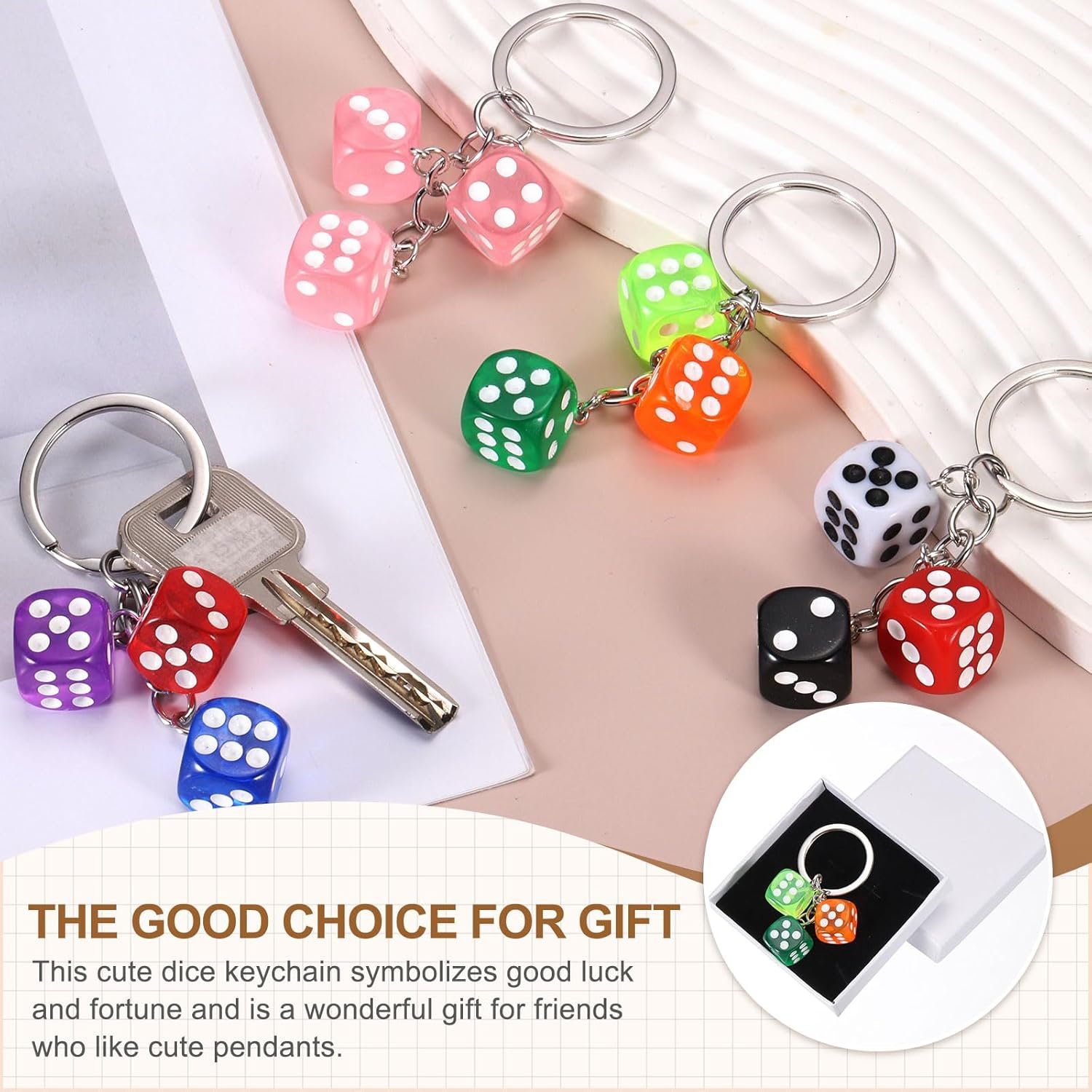 The cute dice keychain symbol good fortune and luck, suitable for various occasions. It can be used as a keychain, handbag pendant, backpack decoration, wallet decoration, or even a car keychain. Its lightweight and portable design makes it good for your daily necessities, whether you are joining a party, gathering, or event. This tiny dice is a beautiful gift for your friends who like dice.