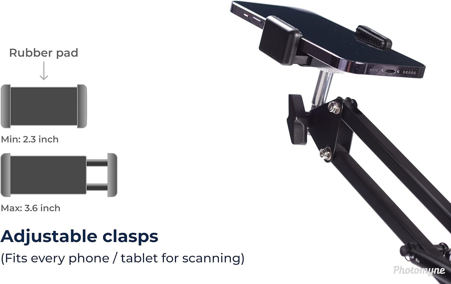 After downloading the app, I followed the link within it to order this phone holder to take steadier scans. got it fairly quickly, but unfortunately, the thread on the screw for the phone holder didn’t match the support arm. it was impossible to tighten the holder under the arm. It kept slipping off because the threads wouldn’t connect. I sent the item back, and after a couple of messages from the customer service people they sent me a new unit that was perfect to the relatively low price point this is an excellent solution. If you plan to scan a high number of photographs, slides, documents using the app. It holds things completely still, so you can voice activate scanning through the app’s functionality. The arm is very stiff and firm and introduces no wobble that the app has to compensate for. I really like the app, and was disappointed that the first unit didn’t work out, but they were able to rectify the situation and enable me to give this a five star review. I order a lot from Amazon, and frankly anyone can make a mistake. I wouldn’t let that count against them in my review, I wanted to mention it in case this is not a one-in-a-thousand type problem.