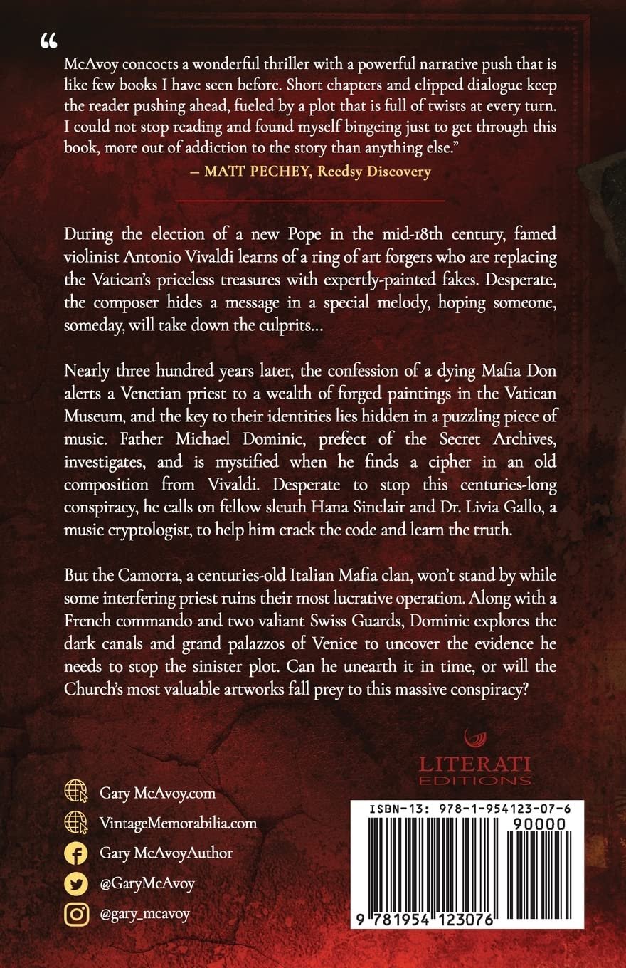 Nearly three hundred years later, the confession of a dying Mafia Don alerts a Venetian priest to a wealth of forged paintings in the Vatican Museum, and the key to their identities lies hidden in a puzzling piece of music. Father Michael Dominic, prefect of the Secret Archives, investigates, and is mystified when he finds a cipher in an old composition from Vivaldi. Desperate to stop this centuries-long conspiracy, he calls on fellow sleuth Hana Sinclair and Dr. Livia Gallo, a music cryptologist, to help him crack the code and learn the truth.